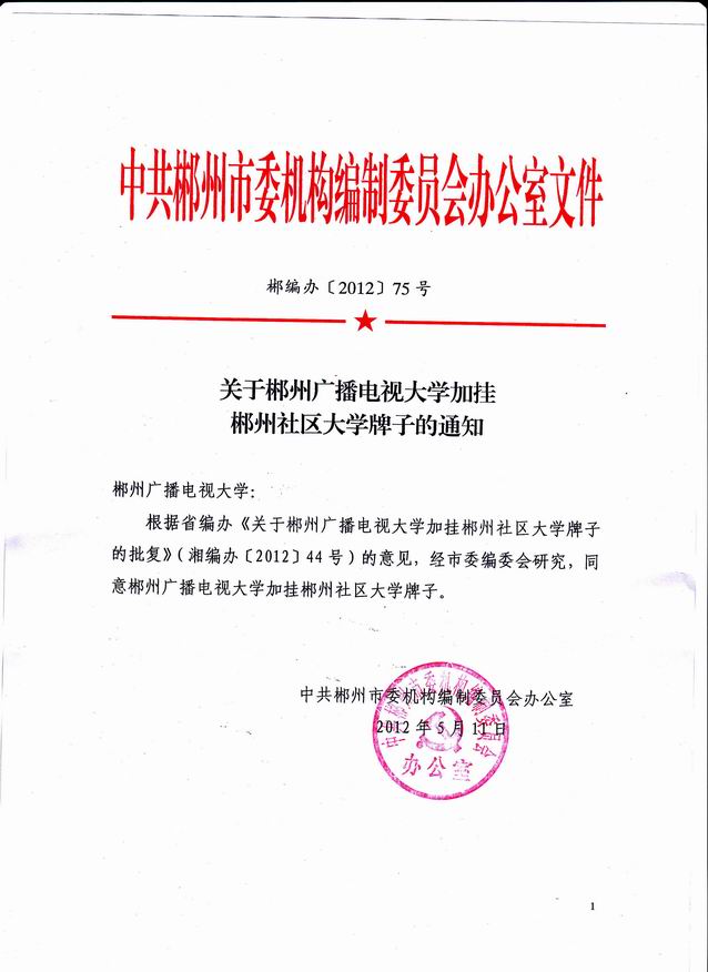 喜讯:5月11日,省编办(湘编办〔2012〕44号)和市编办(郴编办〔2012〕75号)批复,同意在郴州电大加挂郴州社区大学牌子。