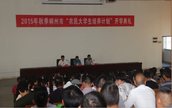 郴州广播电视大学2015年开学典礼隆重举行 10月15日,郴州广播电视大学举行了2015年秋季“农民大学生培养计划”开学典礼。郴州市委组织部、市教育局、市财政局、市人社局等部门相关负责人出席了郴州市电大主会场的典礼。通过视频直播的方式,各县区组织部、教育局、财政局、人社局等部门相关负责人和农民大学生在各县区分会场共同见证了开学典礼的隆重举行,开启了新的求知之旅。 典礼由市教育局副局长刘国雄主持,郴州市电大校长刘爱平致欢迎辞。他向参加本届开学典礼的农民大学生表达了热烈的欢迎,介绍了学校近年来的办学业绩、培养方案以及教学要求,并对学生提出了具体的希望和要求,希望学生充分认识农民大学生的培养意义和自身知识能力的不足,要端正学习态度,强化自觉意识,严格遵守学生管理制度,合理安排自主学习时间,工学并进求得学以致用。 新生代表周满徕代表全体农民大学生对未来的学习做了表态发言,保证一定严守纪律、认真学习,不辜负组织部和学校期望。 市委组织部部务委员、正处级组织员张卫星对此次培训寄予厚望,并提出了明确要求。他指出,“农民大学生培养计划”是我省精准扶贫,强农、惠农、富农的一项重大民生工程,是服务于培养一大批“政治上靠得住,发展上有本事,人民群众信得过”的高素质农村干部人才队伍的重要举措。对学生而言,认真学习与积极交流并重,要做到在“学中干、干中学”,掌握专业技能知识,为今后的工作发展作出新的贡献;对学校而言,要注重实效,提高教学质量,根据已有的“一村一大”教学经验,结合我市农民大学生的实际情况,有的放矢,精心组织好教学管理,强化保障,优化教育教学支持服务。此外,他强调,各部门要协力合作,力促我市“农民大学生培养计划”项目形成培养特色,办成精品工程。 我市农民大学生的培养借助于现代信息技术,采用一站式农民大学生网络空间教育平台,开设了实用性强,农村基层干部急需的知识和技能等相关课程,致力于培养有文化、懂技术、会经营、善管理、能创业的基层党员干部和新型职业农民。 今年,我市共招收了888名农民大学生,分布在全市10个县区。作为我市第一批“农民大学生培养计划”惠民教育项目的受益者,这888名农民大学生将在郴州电大参加农村行政管理、农村经济管理等多个本/专科专业的学习。未来5年内,我市计划每年招收1500名农民大学生,确保为每个村培养至少一名以上的农民大学生,为社会主义新农村建设和基层服务型党组织建设提供智力支持。