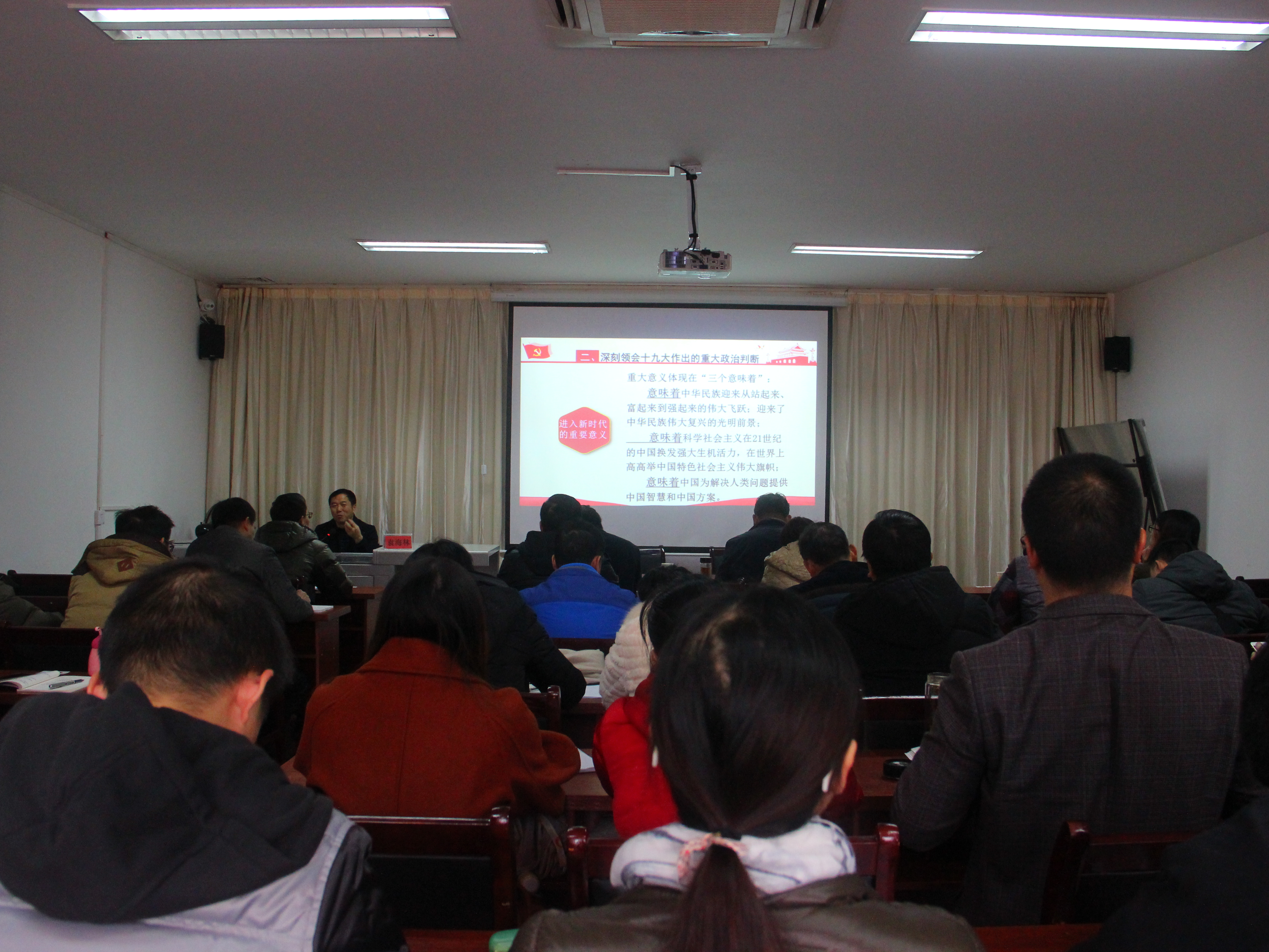 2017年12月15日下午,郴州电大南校区四楼会议室济济一堂、掌声雷动,一场生动的“学习贯彻十九大精神”宣讲会正在开展。此次宣讲会由党委书记扶立平同志主持,市委宣讲团成员、郴州职业技术学院副院长袁海林进行宣讲,我校全体教职工参加了学习。