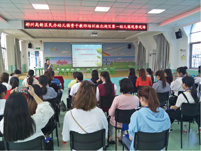 4月23日,培训班全体学员前往北湖区第一幼儿园跟岗学习,对幼儿园的班级环境创设、班级区域活动、大班科学教学等诸多教学领域进行了认真的观摩,并与园内老师们进行了面对面的交流和指导。
