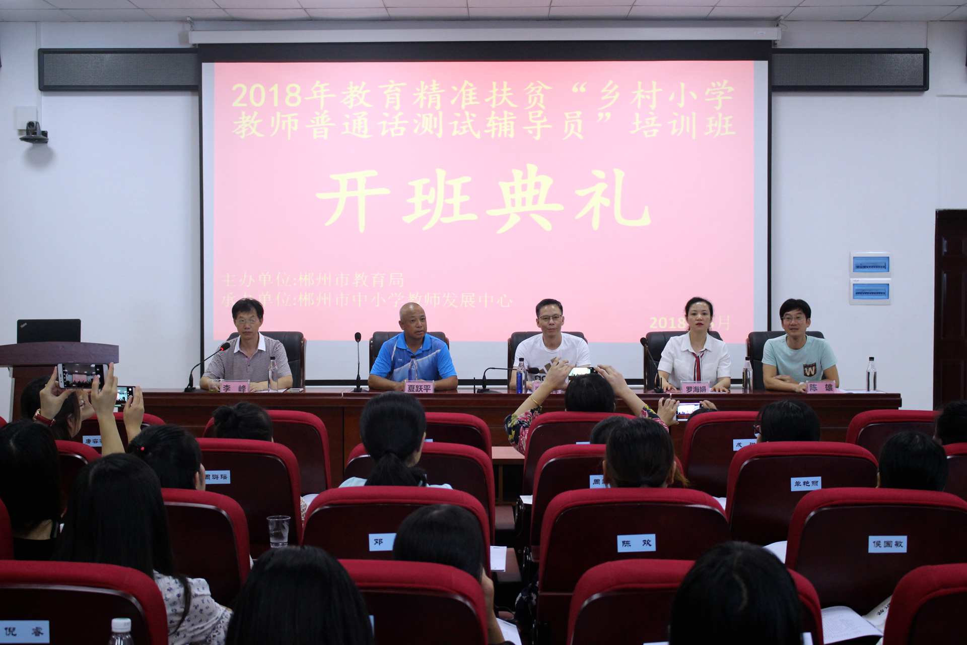 6月24日下午,郴州电大举行2018年郴州市教育精准扶贫“乡村小学教师普通话测试辅导员”培训班开班典礼。该培训班由郴州市教育局主办、郴州广播电视大学中小学教师发展中心承办。全市50名普通话具有二甲高分以上水平的乡村小学教师参与本次培训。