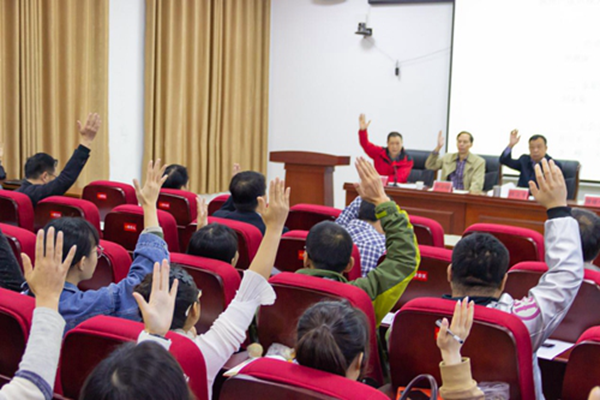 2018年10月18日上午,郴州广播电视大学教职工暨工会会员大会在庄严的国歌声中正式开幕。会议由党委委员、工会主席黄爱平主持,全校在编在岗职工54人参加了会议。会议选举产生了新一届工会委员、工会经审委员会委员、女工委员会委员,听取了学校工作报告、工会工作报告、经审工作报告、我校2017年财务决算和2018年财务预算情况,讨论并表决通过了《郴州电大绩效方案(修订)》和两项提案。