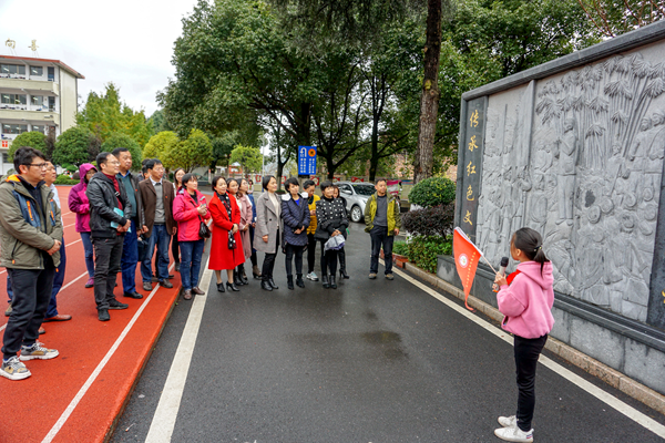 在沙洲村参观完“半条被子”纪念馆后,同志们又驱车来到桂东沙田镇瞻仰军规广场,并与沙田中心完小进行了交流学习,大家被学校的军规文化和“讲军规、立品行”的校训所打动。