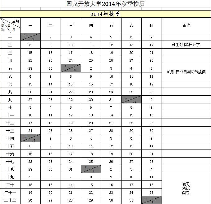 国家开放大学(中央广播电视大学)校历2014年秋季校历